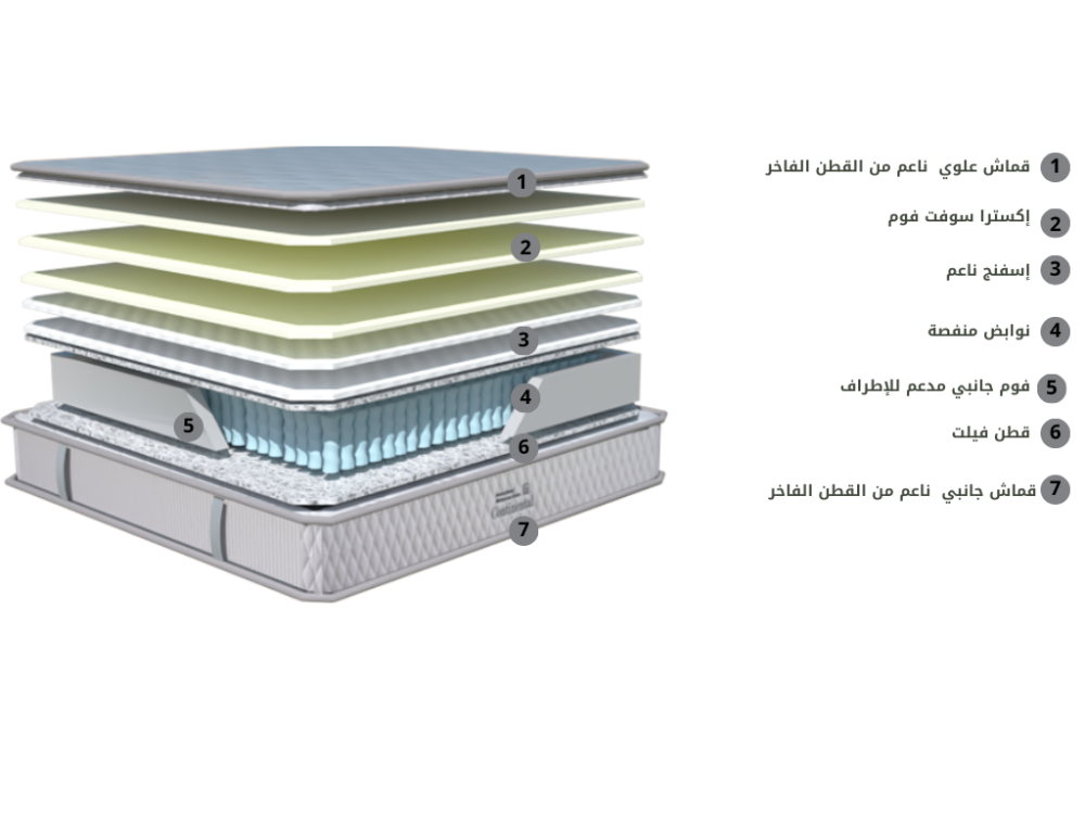 - تصميم متعدد الطبقات يمنح دعماً متكاملاً لجسمك، مع تعزيز الراحة أثناء النوم.