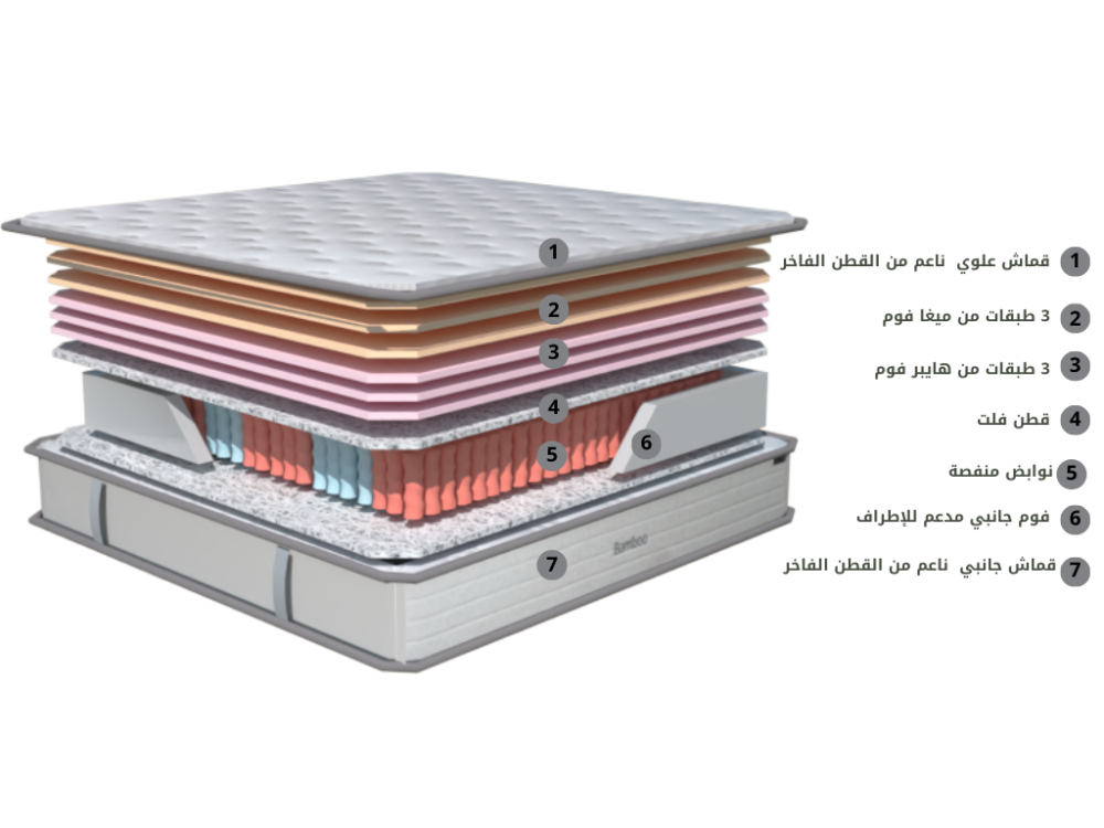 - طبقات الفوم: أربعة طبقات من الهايبر فوم وثلاث طبقات من الميموري فوم لتوفير راحة متكاملة.